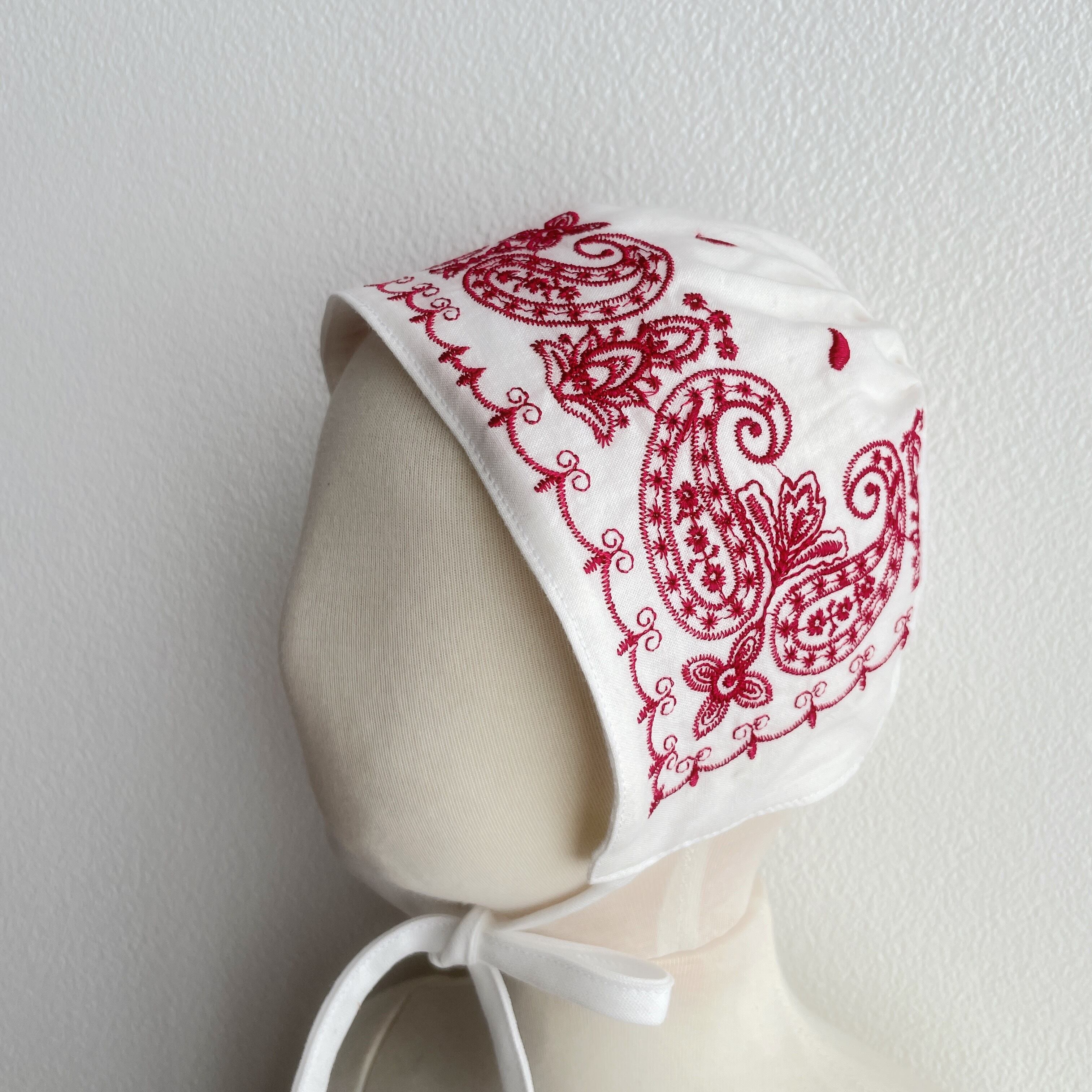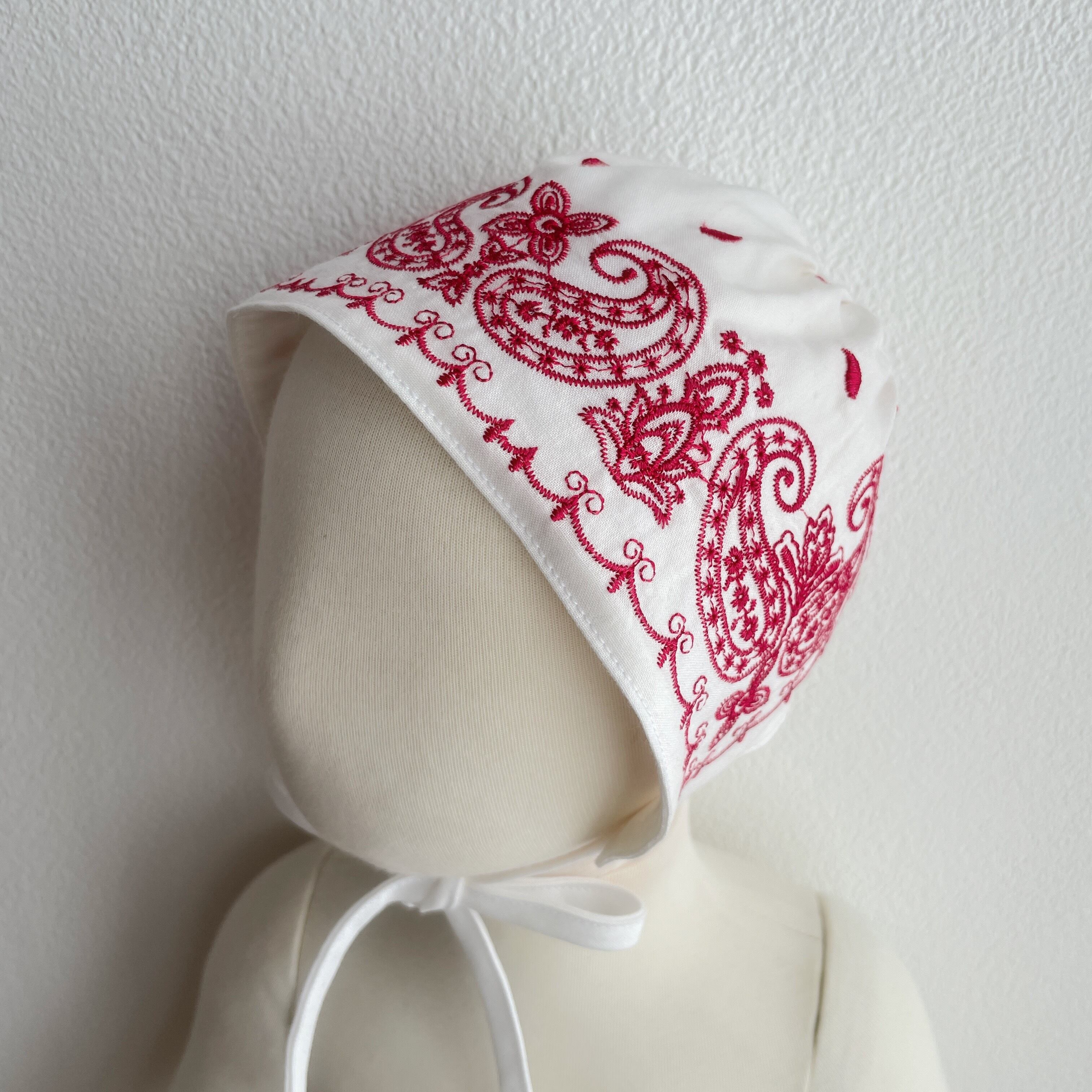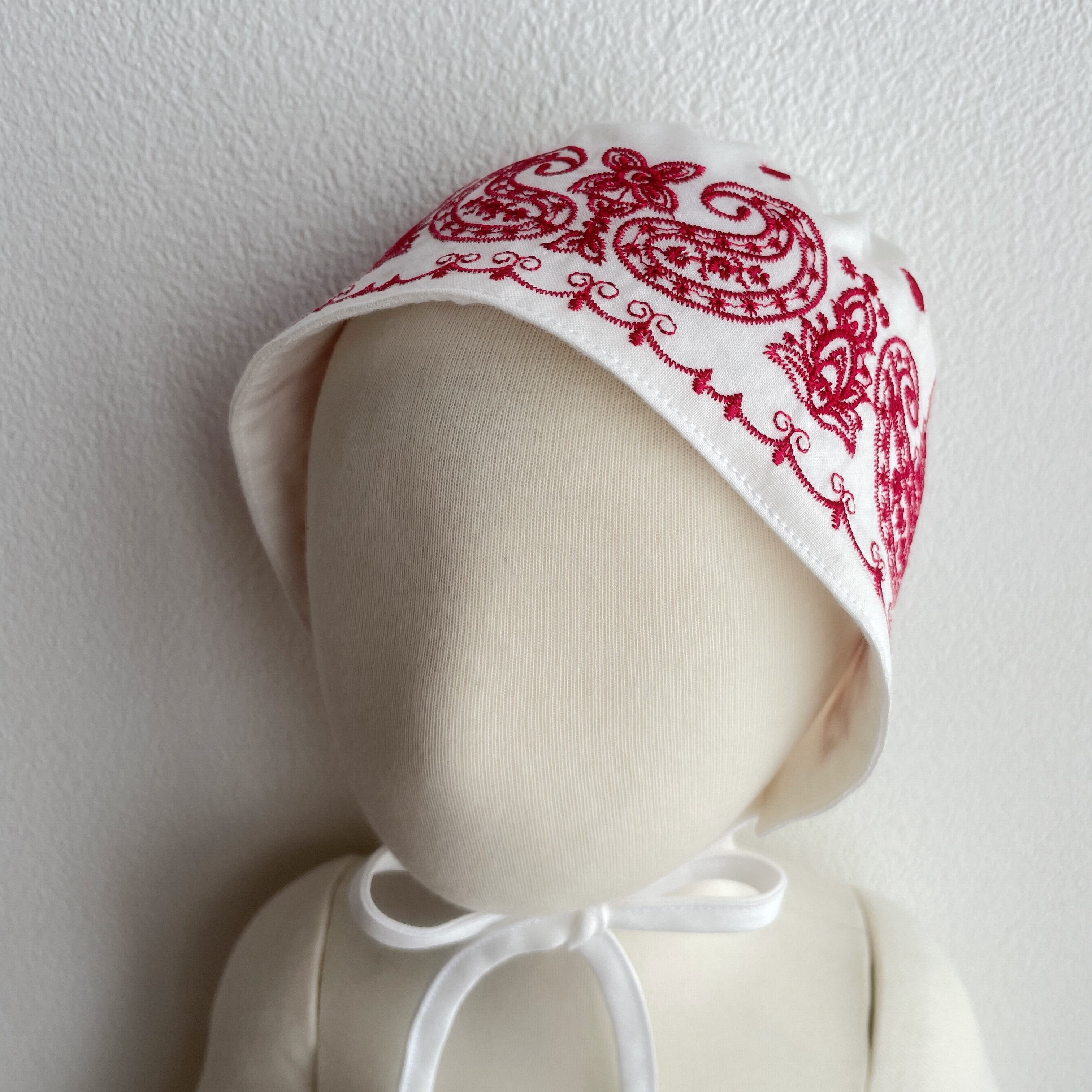 白と赤が目を引く刺繍が施されていて、コーディネートの主役になるボンネットです。