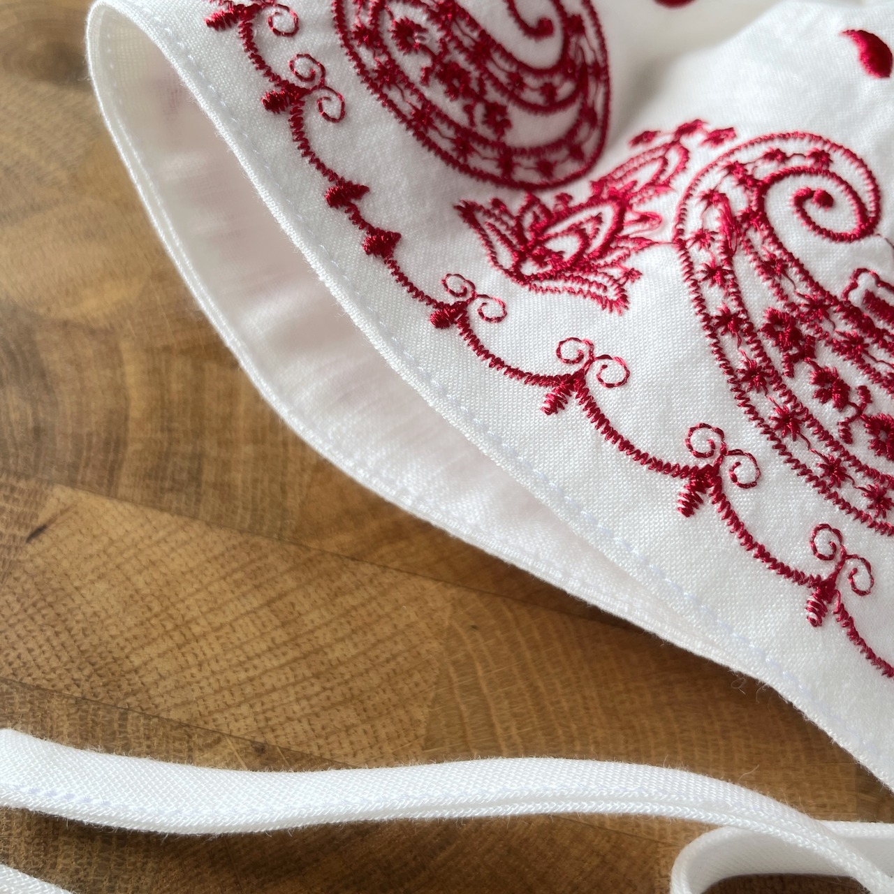 表にはペイズリー刺繍のコットン生地、赤ちゃんのお肌に当たる内側はホワイトのWガーゼを使用したボンネットです。