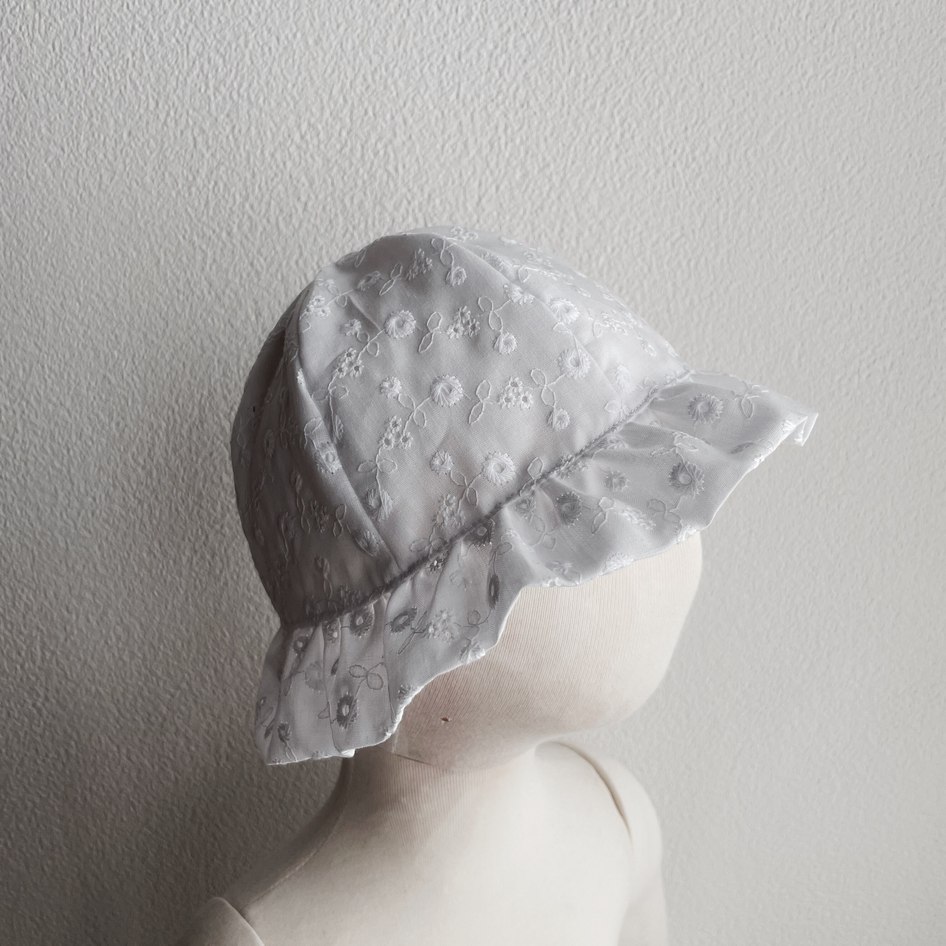立っちするようになった赤ちゃんにおすすめの丸っこいお花のレースを使用した帽子です。