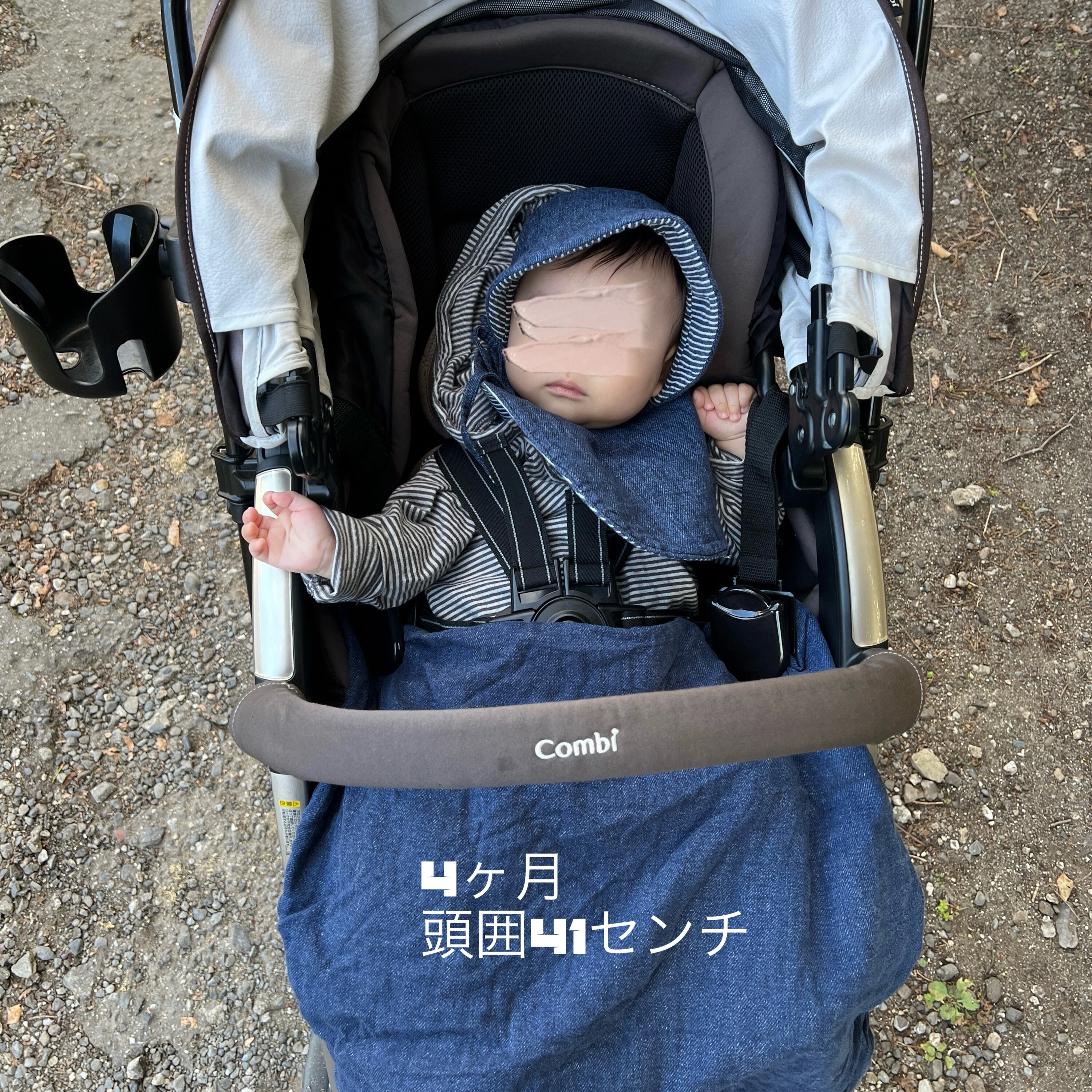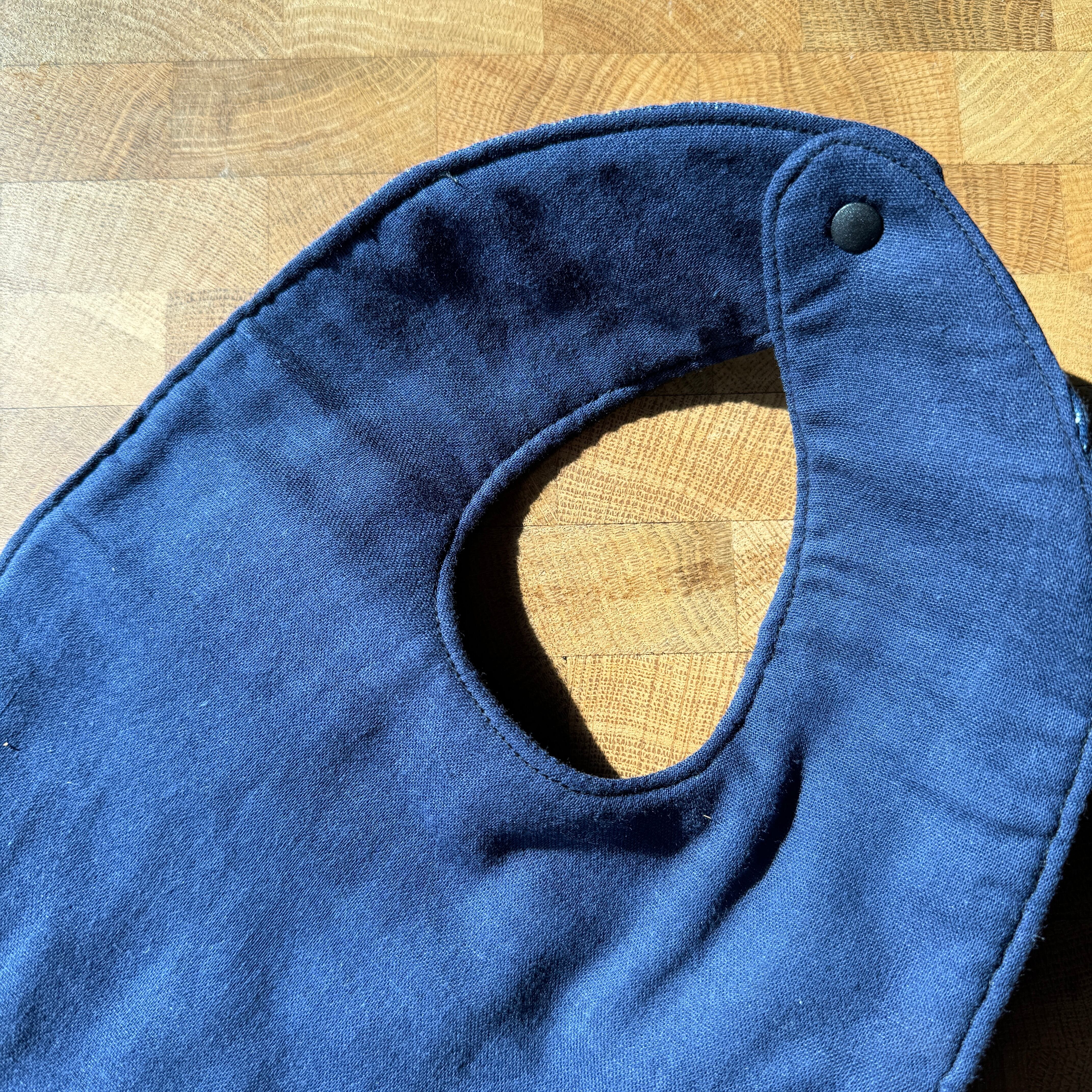 表にはデニム調のWガーゼ、赤ちゃんのお肌に当たる内側は紺色のWガーゼを使用した