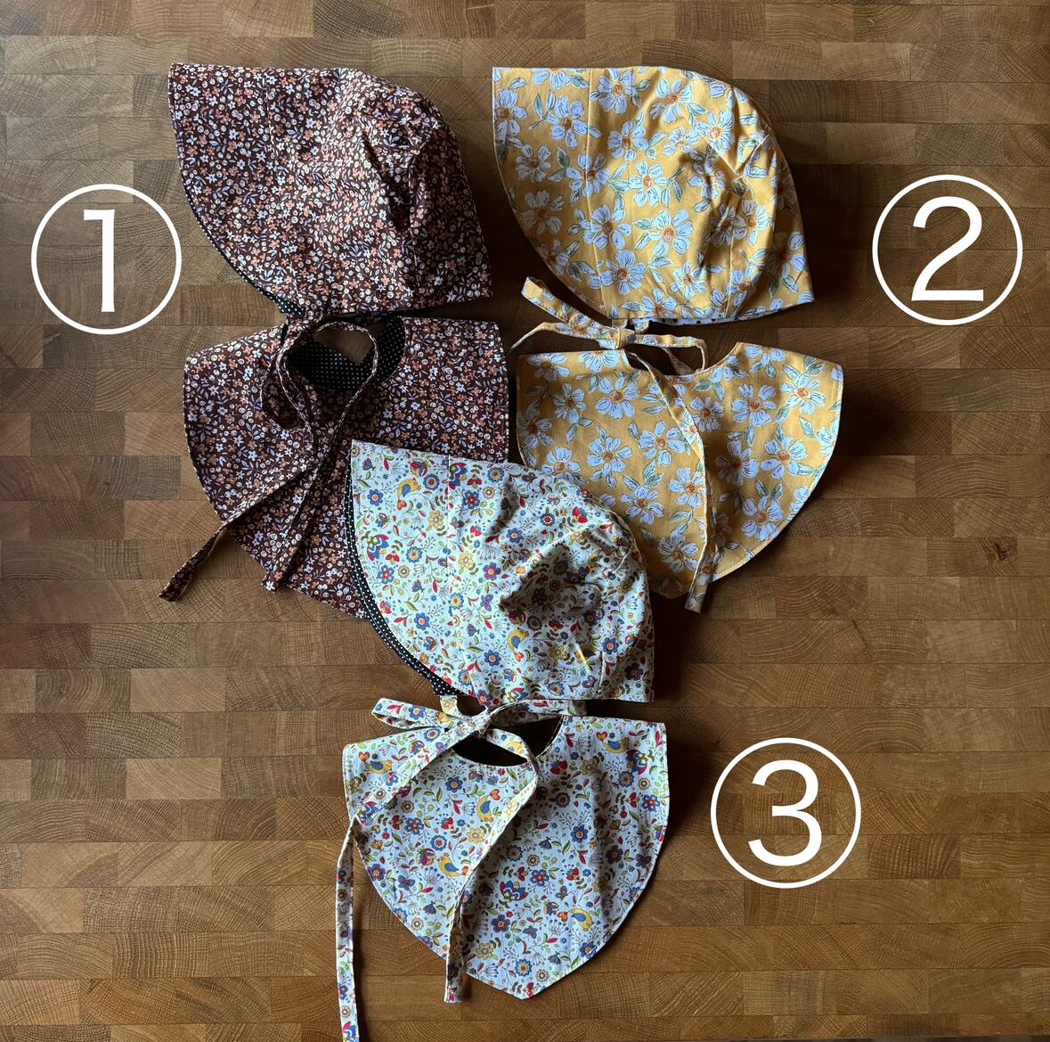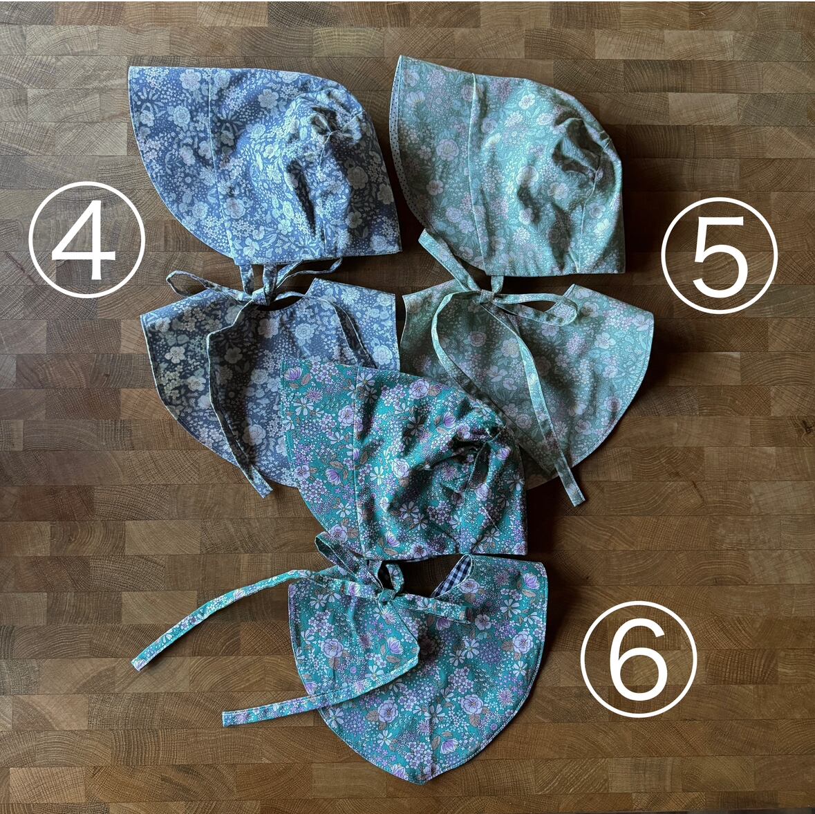 ボンネットのブリムには接着芯を挟んでいるので、洗濯・乾燥しても型崩れしにくく、日常使いしやすく仕上げました。